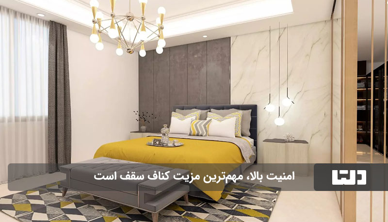 نصب سریع و راحت از جمله مزایای کناف است. تعمیر آسان هم میتواند یک مزیت دیگر برای کناف اتاق خواب محسوب شود. کنافها مقاومت بالایی در برابر زلزله دارند از همینرو کناف سقف میتواند امنیت اتاق خواب شما را بالاتر ببرد. سبکتر بودن این محصولات همراه مقاومت بالای آنها باز هم به بالاتر رفتن امنیت اتاق خواب و ساختمان شما کمک میکند.