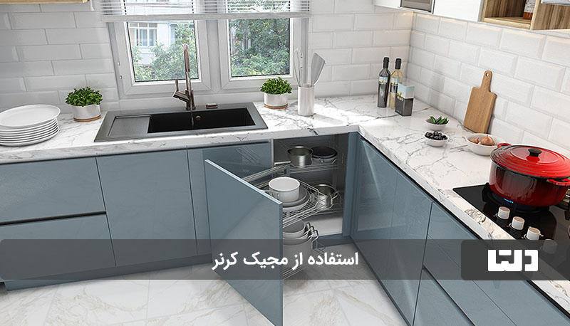 - استفاده از مجیک کرنر: مجیک کرنر همان اهرمی است که با باز کردن کابینت به سمت خود میکشید و میتوانید درون آن لوازم آشپزخانه را قرار دهید.
