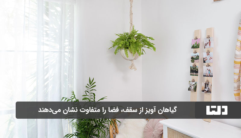 گیاهان آویز از سقف جلوهای زیبا و باشکوه به فضای پذیرایی شما میبخشند. انواع گلدانهای تزئینی کوچک را میتوانید با بندهای و قلاب مخصوص از سقف آویزان کنید. از آویزهای تزئینی مکرومه نیز میتوانید برای این کار استفاده کنید.