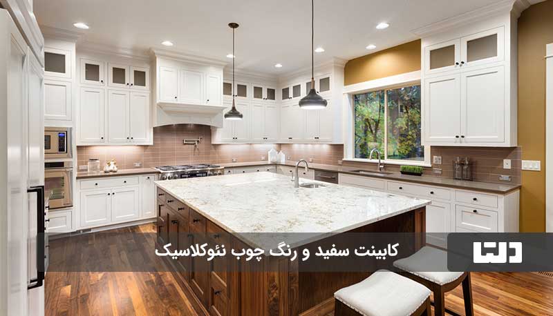 کابینت سفید و رنگ چوب به سبک نئوکلاسیک