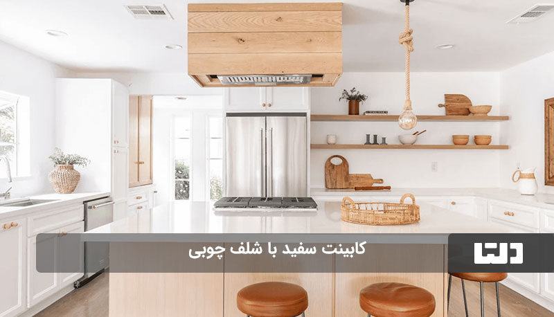 استفاده از شلف چوبی در آشپزخانه با کابینتهای سفید ایده خوبی است. شلف آشپزخانه در نقش فضای اضافی برای ذخیرهسازی لوازم و مواد غذایی ایفای نقش میکند و در مدلهای مختلفی قابل سفارش است. همچنین میتوانید روی شلف را با تابلوهای دکوری و انواع مجسمههای زیبا تزیین کرده و جلوه زیبایی به آشپزخانه خود ببخشید.