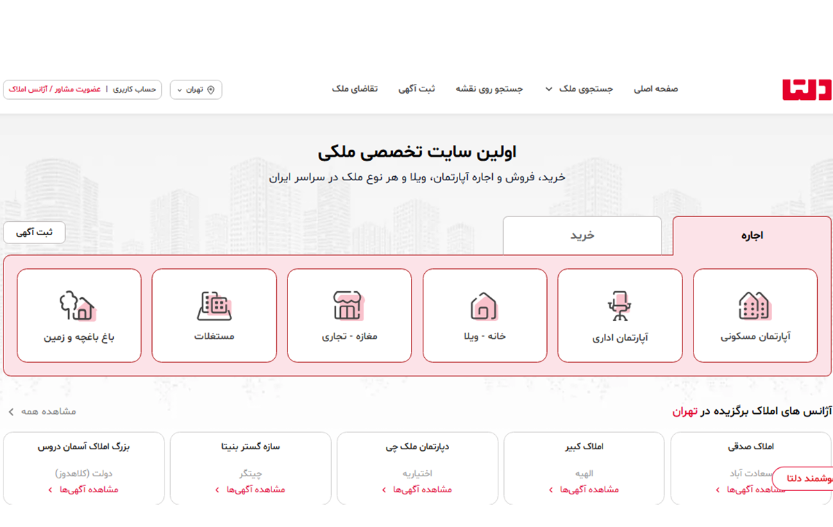 خانهای که با سبک زندگی و توان مالیتان هماهنگ باشد، یکی از مهمترین تصمیمهای زندگی است. اما در بازار پیچیده و متغیر امروز، پیدا کردن ملک مناسب میتواند به چالشی جدی تبدیل شود. درست در همین نقطه است که دلتا وارد میشود؛ پلتفرمی که با ترکیب تجربه چندین ساله در حوزهی املاک و فناوریهای نوین، تجربهای نو از جستوجوی خانه را برای شما رقم میزند. سایت دلتا با تکیه بر تجربه و فناوری، این مسیر را برای شما دقیقتر و مطمئنتر کرده است..