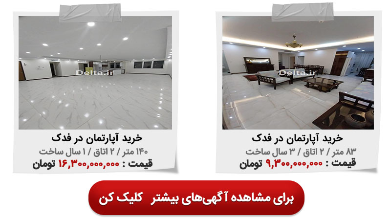در جدول زیر می‌توانید چند نمونه آگهی خرید آپارتمان در محله فدک از سایت ملکی دلتا را مشاهده کنید.