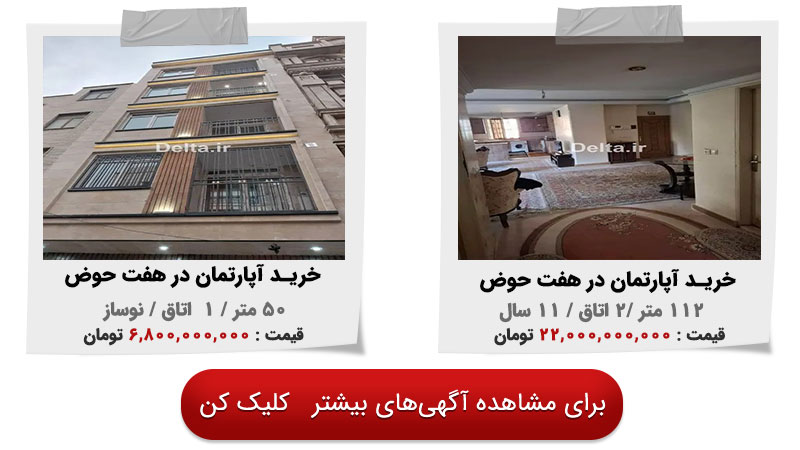 در جدول زیر میتوانید چند نمونه آگهی خرید آپارتمان در هفتحوض از سایت ملکی دلتا را مشاهده کنید.