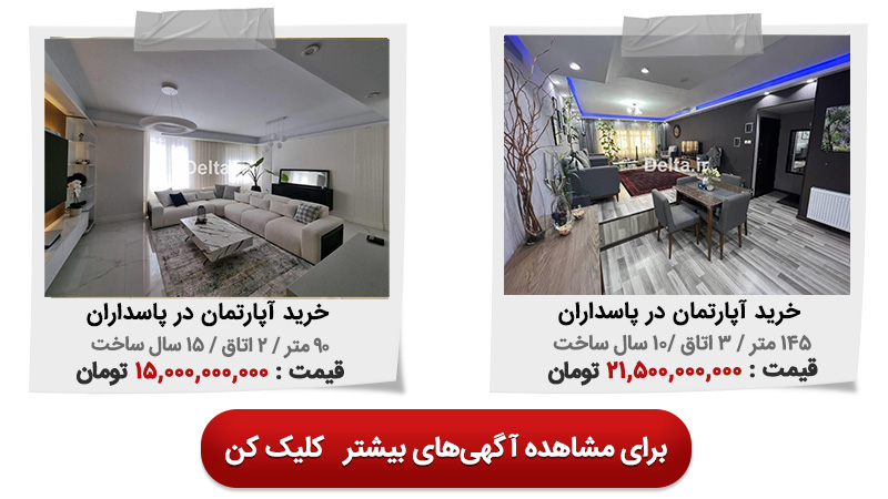 در جدول زیر میتوانید چند نمونه آگهی خرید آپارتمان در پاسداران از سایت ملکی دلتا را مشاهده کنید.