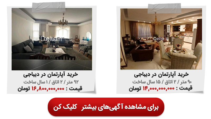 در جدول زیر میتوانید چند نمونه آگهی خرید آپارتمان در دیباجی از سایت ملکی دلتا را مشاهده کنید.