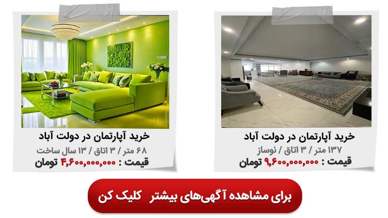 در جدول زیر میتوانید چند نمونه آگهی خرید آپارتمان در دولت آباد از سایت ملکی دلتا ار مشاهده کنید.
