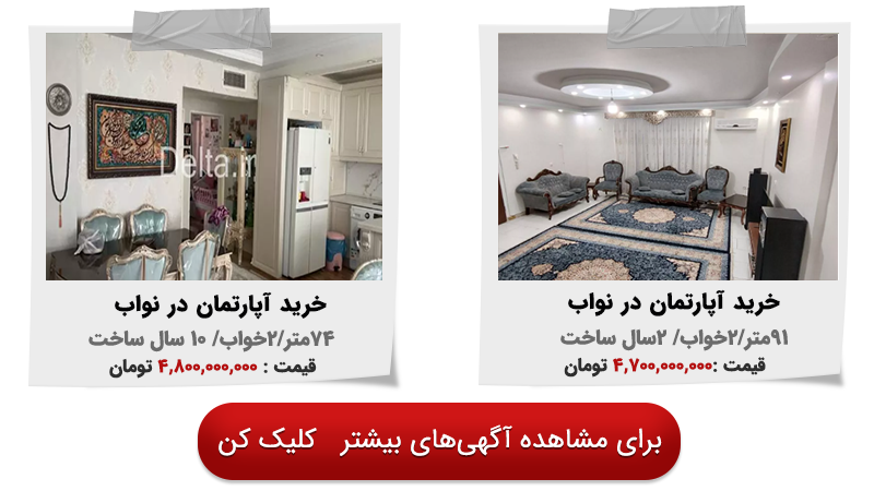 در جدول زیر میتوانید چند نمونه آگهی خرید آپارتمان در نواب از سایت ملکی دلتا را مشاهده کنید.