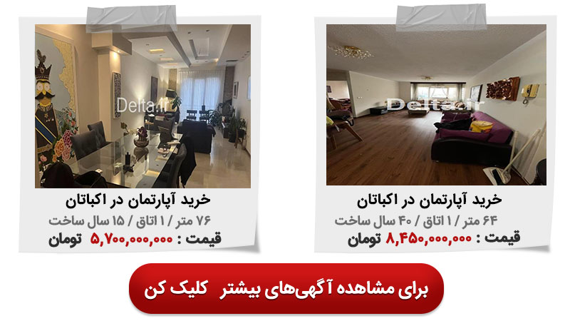 در جدول زیر می توانید چند نمونه از قیمت خرید آپارتمان در شهرک اکباتان از سایت ملکی دلتا را مشاهده کنید.