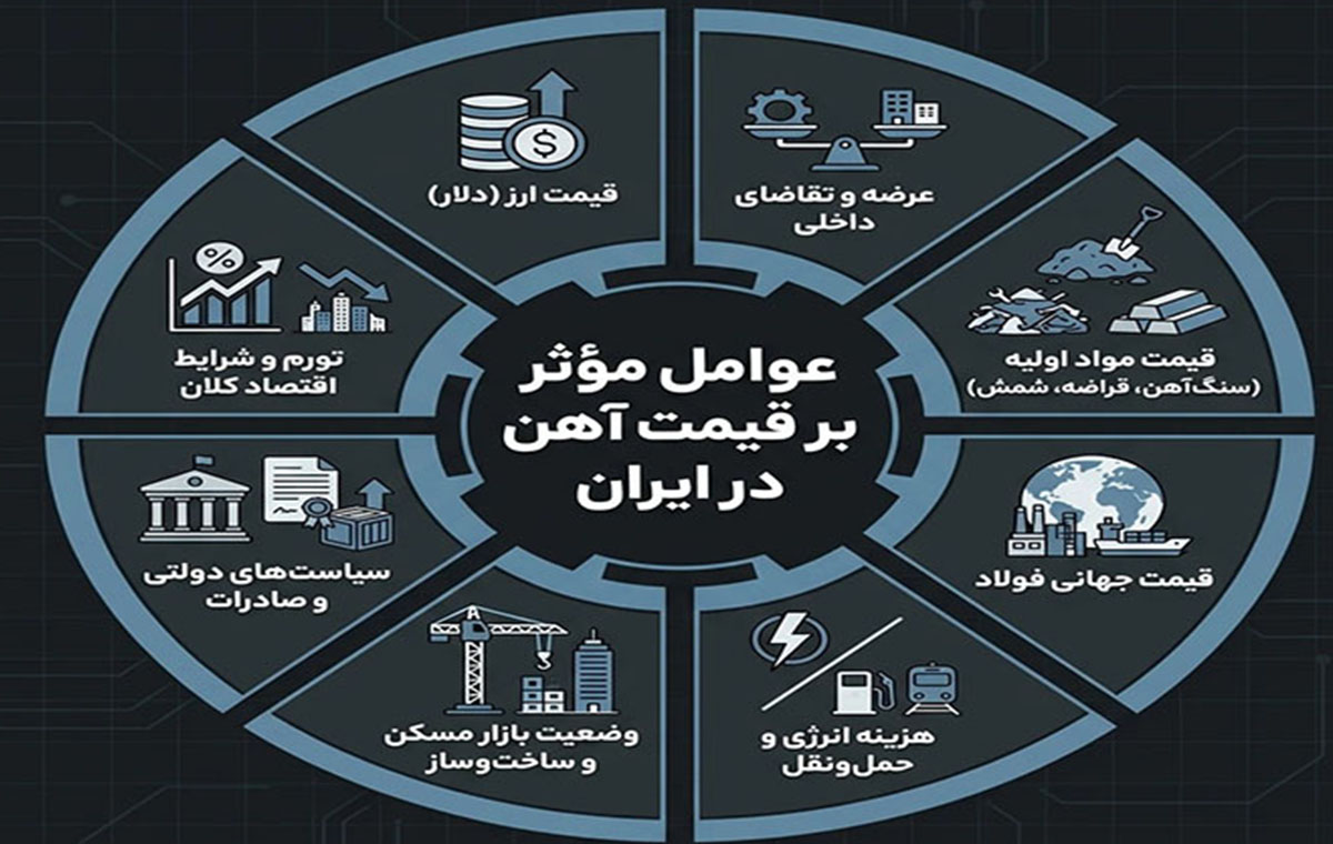 قیمت آهن در ایران حاصل برهمکنش عوامل متعددی مثل قیمت ارز، عرضه و تقاضا، هزینه مواد اولیه، وضعیت بازار مسکن، انرژی، سیاست های دولتی و شرایط اقتصاد کلان است.